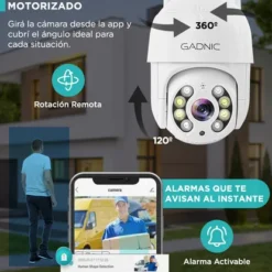 Integra un sistema de detección de movimiento con alarma sonora. Notifica al instante en el celular cuando identifica actividad sospechosa, para que actúes rápido.